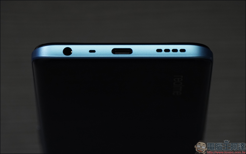 在 realme 8 5G 機身底部,由左至右依序為 3.5mm 耳機接孔、麥克風、 USB Type-C 充電連接埠和揚聲器。