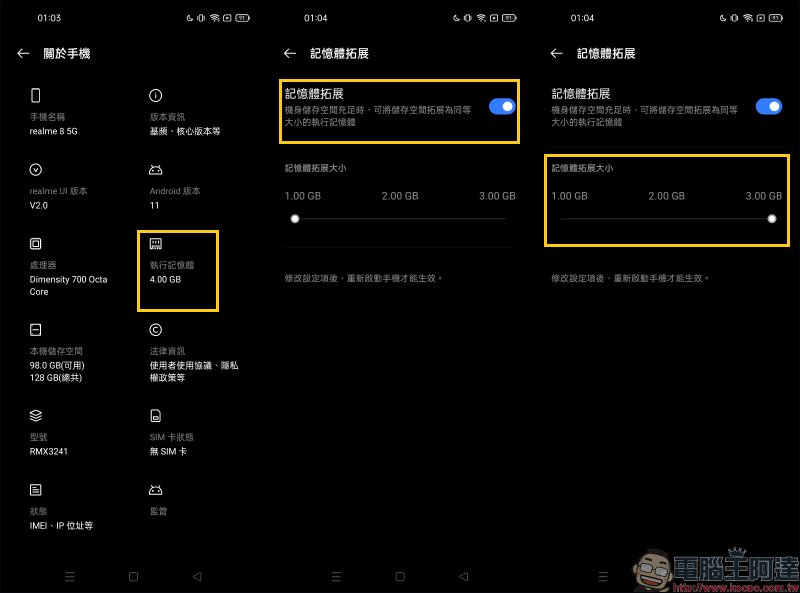 另外,針對多工處理需求這次 realme 8 5G 加入 DRE 動態記憶體擴展技術,讓用戶能將手機的部分儲存空間(ROM)作為 RAM 使用。若想開啟 DRE 動態記憶體擴展技術功能,可先前往「設定」>「關於手機」> 點選「執行記憶體」,接著就能調整要使用多少的儲存空間作為 RAM 使用囉!