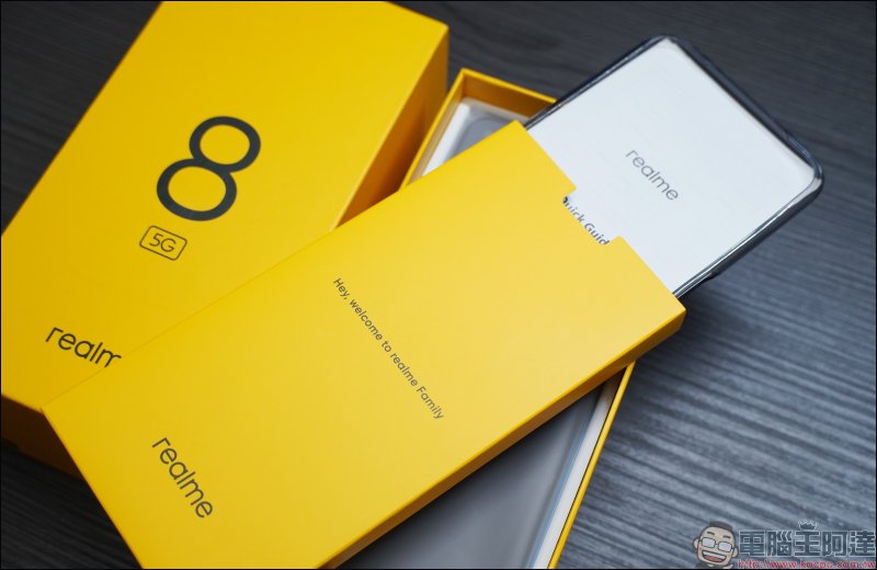 話不多說直接來開箱 realme 8 5G ,一如往常 realme 經典的黃色包裝盒,打開後可看到歡迎加入 realme 大家庭的標語,對於許多預算有限、同時想尋找一款 5G 手機的消費者說,這或許是讓荷包沒有太大負擔就能輕鬆入手的 5G 手機。