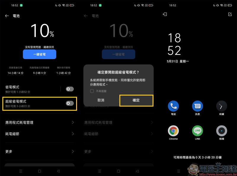 在「超級省電模式」下,能讓 realme 8 5G 即便可在 5% 電量的情況下待機 34.2 小時,或社群線聊天 89 分鐘。以下筆者也實測模擬日常和朋友用 LINE 文字聊天和語音通話、上網瀏覽文章,甚至是一邊聊天一邊看 YouTube 影片的情境,經測試這樣的使用從電量 10% 消耗至 5% 能使用約 3 小時的時間。