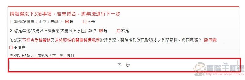 點選能預約的院所後,就會出現事項符合確認視窗,包含「您是設籍臺北市之市民嗎?」、「您是年滿85歲以上長者或65歲以上原住民嗎?」、與「 您若不符合受檢資格及未依照特約醫事機構規定辦理登記,醫院將取消已取號後之登記資格,您同意嗎?」等3點,三點都必須勾選是及同意後,才能按「下一步」按鈕。