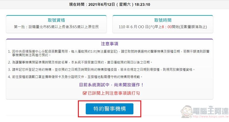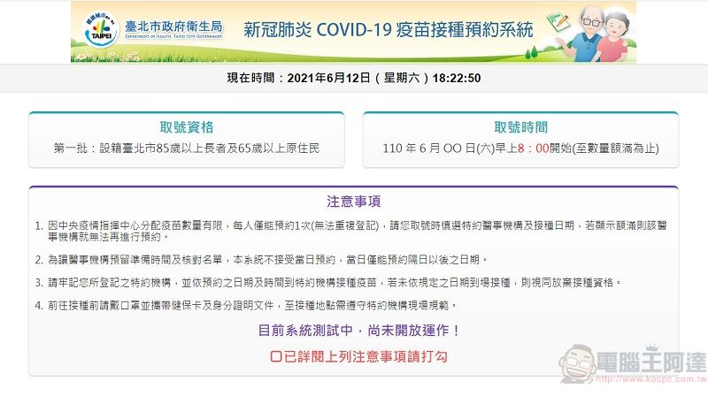 台北市「新冠肺炎COVID-19疫苗接種預約系統」按時間預計明日早上八點開放,因此系統會出現「目前系統測試中,尚未開放運作(系統稍晚已暫時關閉)」。首先在預約系統首頁能看到取號資格、取號時間與注意事項,確認沒問題後勾選「已詳閱上列注意事項」。