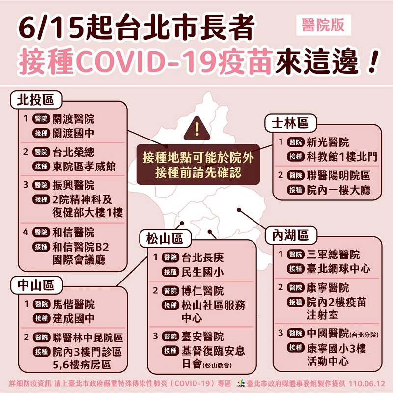 台北市政府有針對北市長者預約COVID-19疫苗做相關宣傳海報,除了列出台北市施打院所、預約時間與預約對象外,亦可透過海報上的QRCODE連結至台北市「新冠肺炎COVID-19疫苗接種預約系統」。