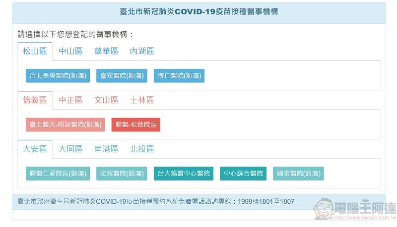 在「臺北市新冠肺炎COVID-19疫苗接種醫事機構」頁面中,能根據行政區在選擇想預約的院所,如果額滿就會在院所旁出現「(額滿)」字樣。