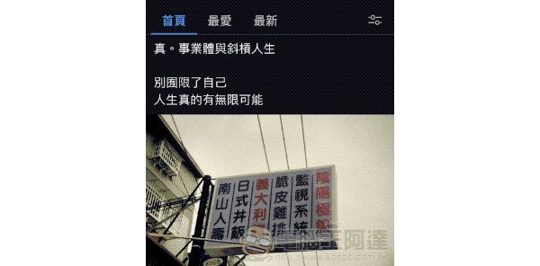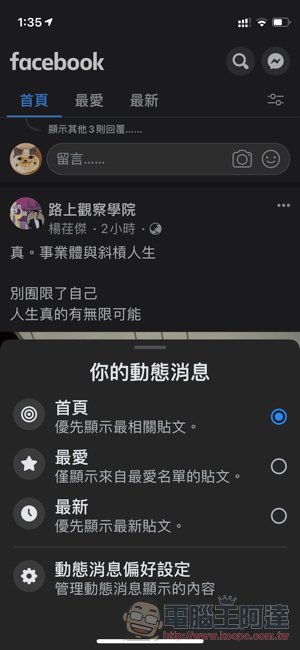 其實因為這功能可以刷出來的時間點太奇耙的關係,個人覺得臉書搞不好哪天不爽又會突然拿掉。但就小編現在的使用體驗來說,真的會覺得可以快速切換到「最新動態」實在是太方便了。它的用法就像上面的 GIF 動圖這樣,需要有點抽蓄地上下滑動動態消息,才會看到滑出「首頁 / 最愛 / 最新」三個頁面,還搭配一個動態消息的進階設定按鈕。