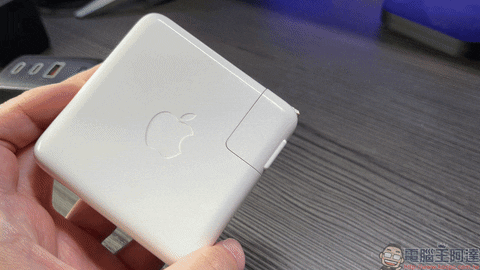 首先來看一下使用一段時間的 Apple 原廠 61W USB-C 充電器,可以發現其實多年來 Apple 這類具備摺疊插頭的充電器都會遇到插腳鬆脫的問題,當收摺後很容易無法完全收納置固定的位置。