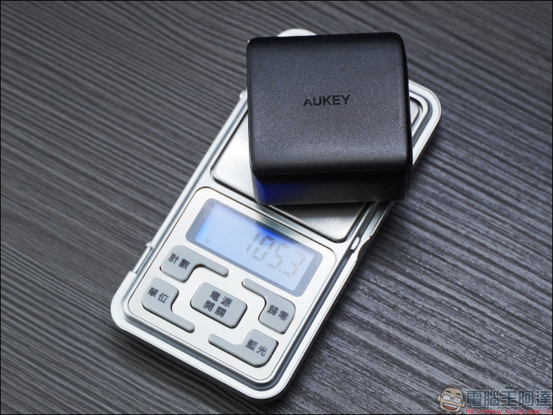 重量方面, AUKEY 官方說明 Omnia Duo 65W(PA-B4)重量為 108 克,不過經筆者實測其重量僅有 105.3 克。