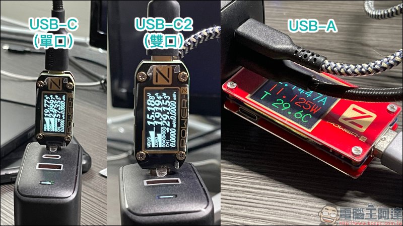 經過充電實測, AUKEY Omnia Mix 3 90W(PA-B6S) 的 USB-C1 接口單獨為 13 吋 MacBook Pro 充電時,可提供約 57W 至 60W 左右的功率;在兩個充電接口同時使用時, USB-C2 則可提供 29W 至 30W 左右的功率;至於 USB-A 接口則可在三孔同時使用時提供 11W 至 12W 左右為 iPhone 進行充電。
