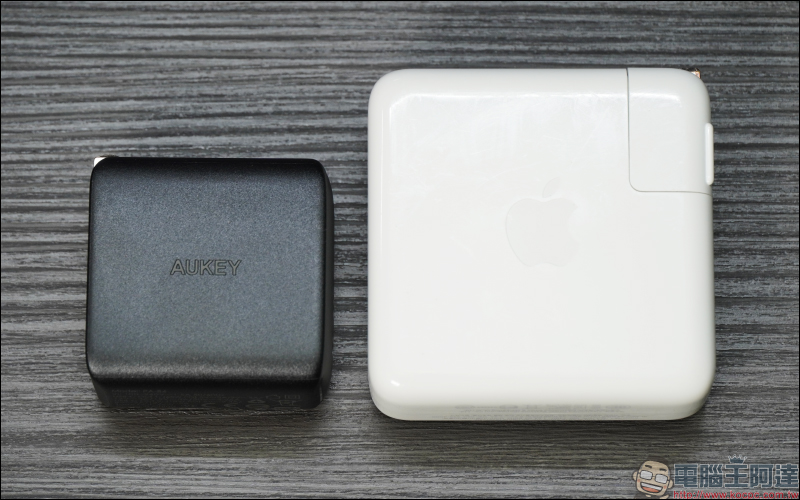 接著將 AUKEY Omnia Duo 65W(PA-B4)與 Apple 61W USB-C 充電器比較尺寸,可以發現體積整整小了約 50% 。