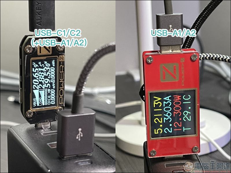 AUKEY Omnia Mix 4 100W(PA-B7)的 USB-C1/C2 接口單獨充電時可提供最大 100W 輸出,以 13 吋 MacBook Pro 進行充電實測約可提供 60W 功率;當 USB-C1 和 USB-C2 兩個充電接口同時使用時,則可分別提供最大 45W 功率,實測為 MacBook Pro 和 iPad Pro 同時充電則都有 44.45W 。