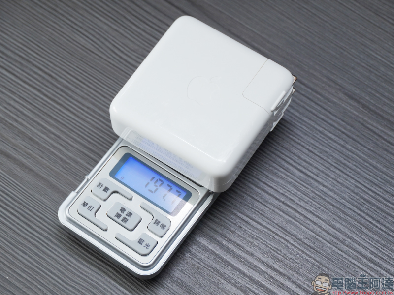 對比 Apple 61W USB-C 充電器重量則為 197.7 克。