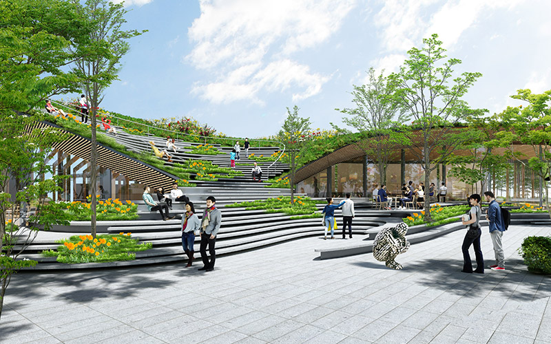 全新的勤美術館隈研吾以「森」為概念,如同小丘起伏的屋頂上覆蓋滿滿的綠色植物,與多樣性的花卉盆栽,於美術館主體外觀種植上樹木,在陽光的照射下穿過樹枝透出的光影讓人感到好是愜意。其中,還有一條寬敞的人行道,一路從美術館上方延續到草延到之上,串連起附近商家與景點,與其完美合一。