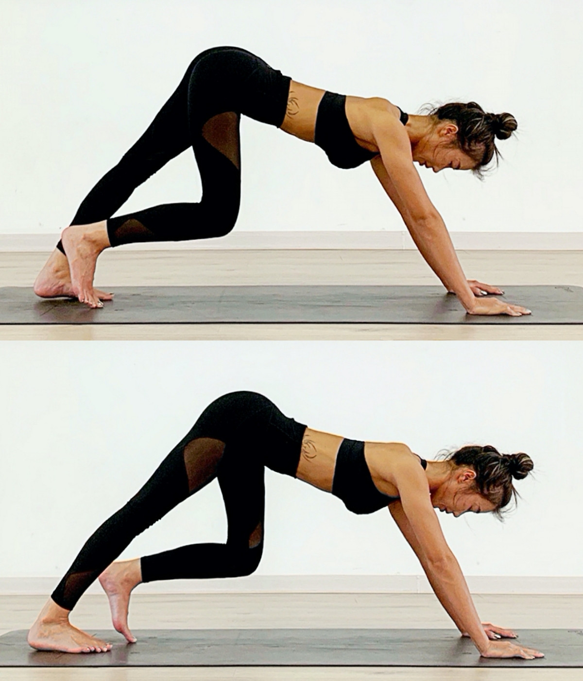雙手雙腳撐地、將臀部抬起,整個身體呈現倒V字形,接著將腳後跟往上踮腳、再著地,一樣感受後側小腿肌的伸展,重複動作30秒為一組,一次做2-3組。