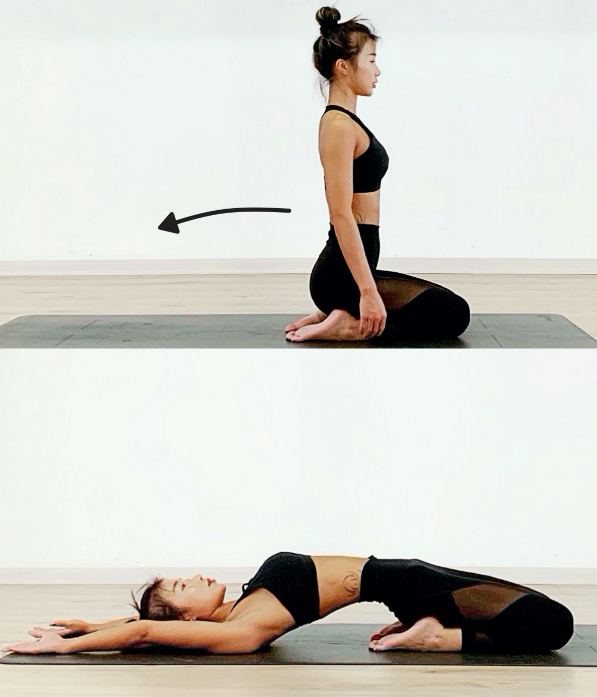 先跪坐在床上或地面上,將臀部坐在兩腳之間,呼氣將身體向後躺平,雙手手臂伸展過頭,彎曲雙肘時將手肘向上,維持30秒-1分鐘,感受肩頸、胸背及手臂的伸展,這個動作對於大腿前側也有拉伸效果。