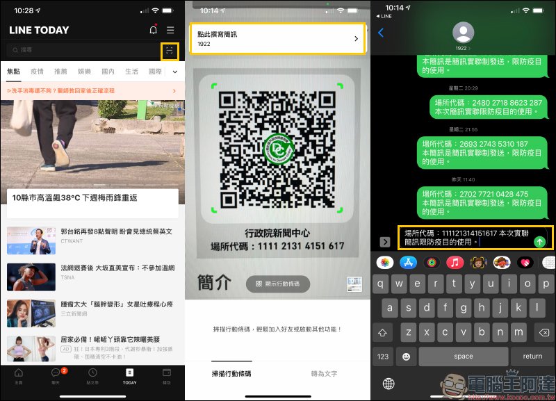 開啟後,靠近店家的簡訊實聯制 QR Code 條碼進行掃描,畫面上方就會出現「點此填寫簡訊1922」視窗,點擊就會自動跳轉至手機簡訊頁面,這時確認傳送號碼為 1922 後,即可將訊息送出。
