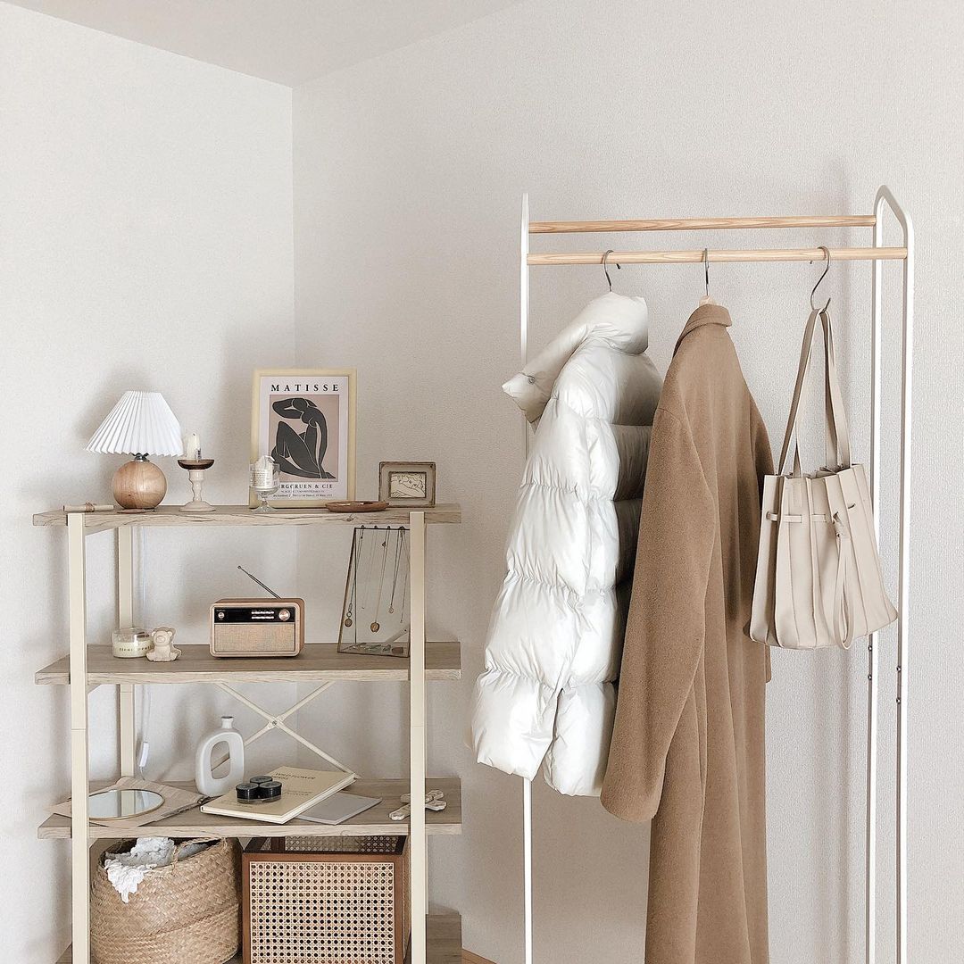 這種一個人住的房間,屋子本身的收納空間可能比較少。建議大家在房間裡放個掛衣架。你可以將隔天要穿的衣服掛在架子上,或是用它來掛平日常穿的外套或工作制服喔!