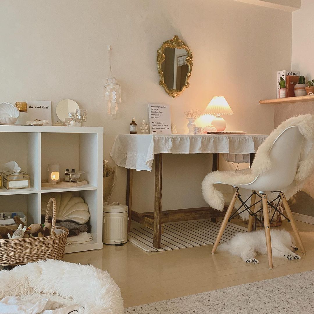 間接照明有助於提升房間的視覺層次。白天可以當作時尚擺飾,晚上開了燈,又能改變房間的氣氛。間接照明可以設置在床邊、架子或書桌上,你可以根據自身需求挑選適合的款式。韓系百摺燈或是IKEA、MUJI的極簡風燈具都很不錯喔!