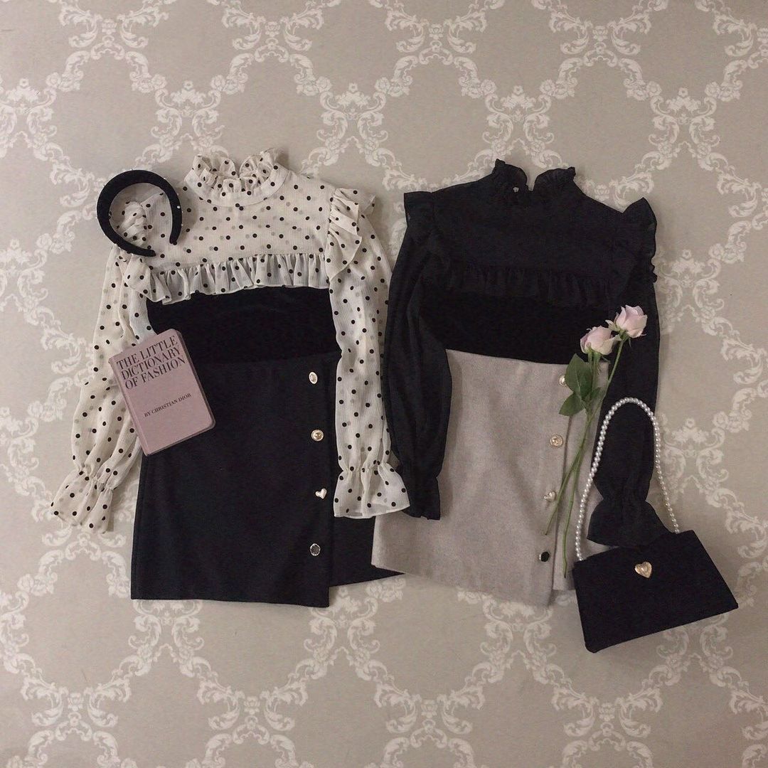 這件套裝以微透雪紡紗搭配天鵝絨材質,看起來高雅又可愛。荷葉邊的裝飾不會太過孩子氣,反而有種成熟可愛的感覺。這款商品一共有「黑色上衣×黑色圓點」「象牙色上衣×黑色圓點」兩種款式。搭配最近流行的仿皮革配件,妳就能瞬間成為時尚達人!