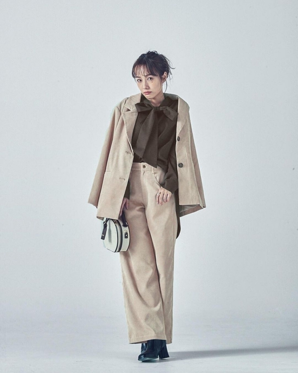 燈芯絨材質的西裝外套與長褲,展現出時尚洗鍊的風格。寬大的衣領充滿存在感,也讓臉看起來更加清爽俐落。褲子的寬鬆剪裁也是令人欣喜的設計。這款商品一共有米色、棕色、黑色三種顏色。