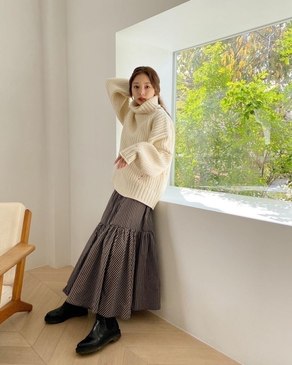 這款窄裙以羊毛製成,充滿冬天的感覺,長裙後方還加入了開衩設計。卡其色調給人沉穩的感覺,很適合平常穿。衣服穿起來柔軟又暖和,冬天的衣櫃裡一定要有一件才行!搭配合身的上衣,就能打造出優雅的淑女風穿搭。