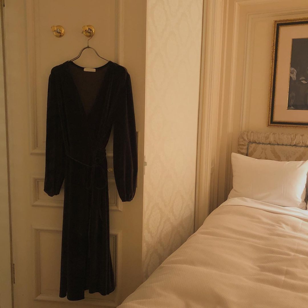 這款連身裙的胸前採用交叉V領式的設計,看起來非常高雅。腰身的鬆緊設計則能強調女性特有的曲線。沉穩的棕色搭配天鵝絨材質,讓衣服散發出一股高級感。