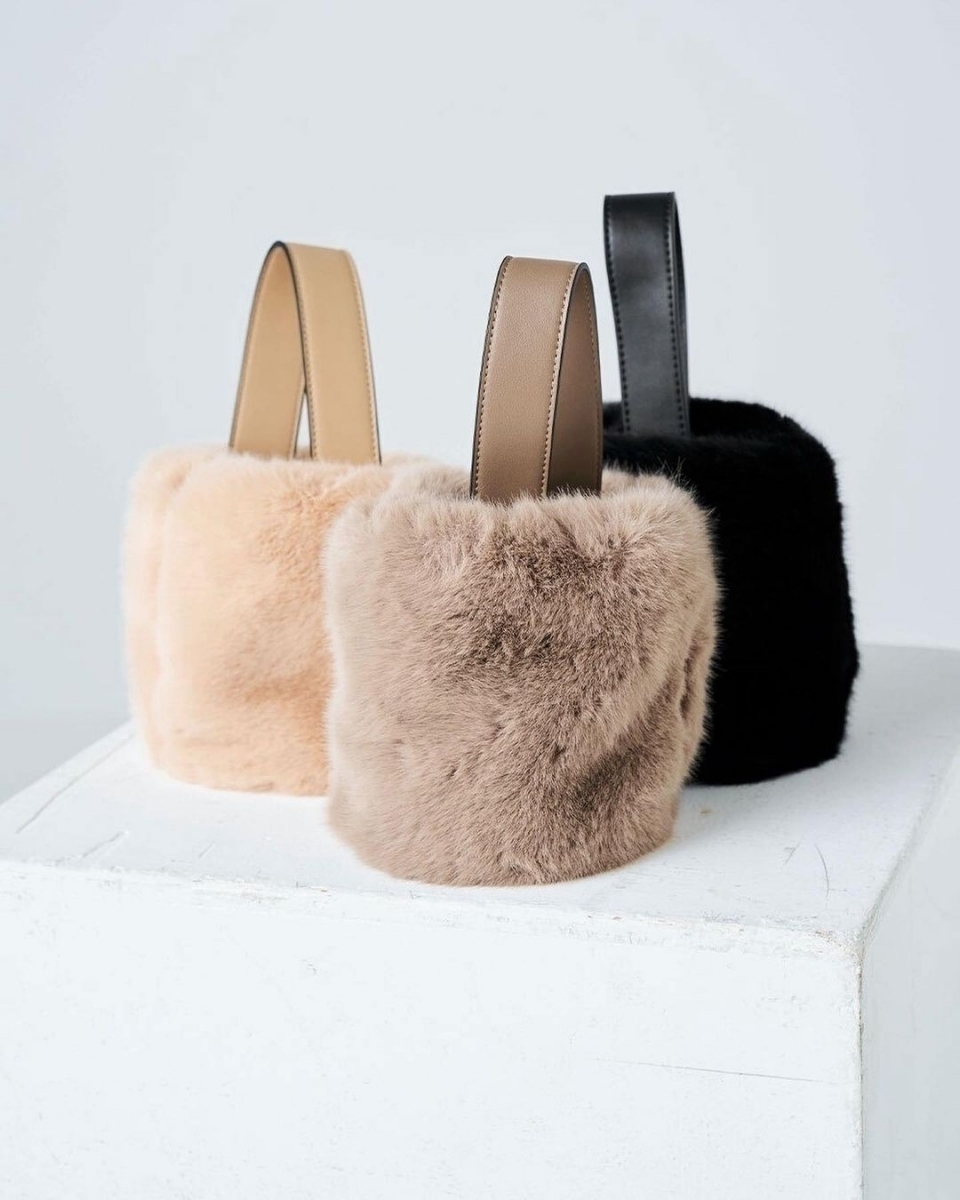 這款包包有著鬆軟的絨毛與圓潤的外型,非常可愛。提把的部分是選用2020年流行至今的環保皮革來製作,散發出一股高級感。此外,包包還附贈斜背帶,有手提、肩背這兩種背法,可以根據當天的穿搭與心情來自由變換造型。這款商品總共有米色、棕色、黑色這三種顏色。