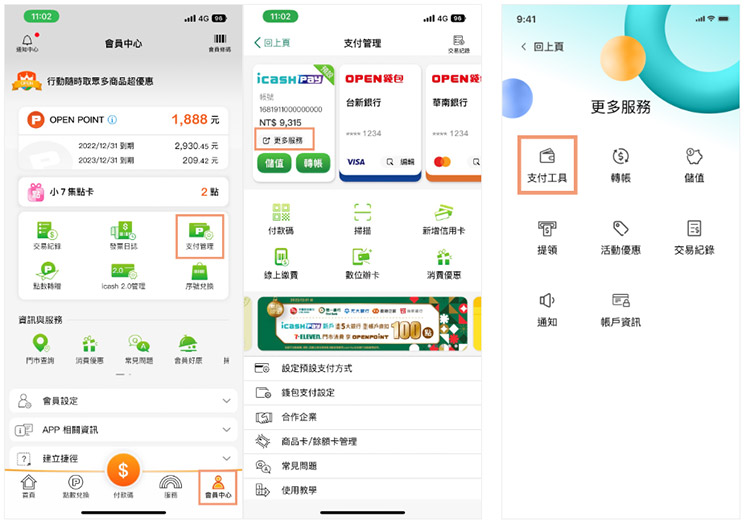 1.點選【會員中心】> 選擇【支付管理】> 點選【icash Pay更多服務】
