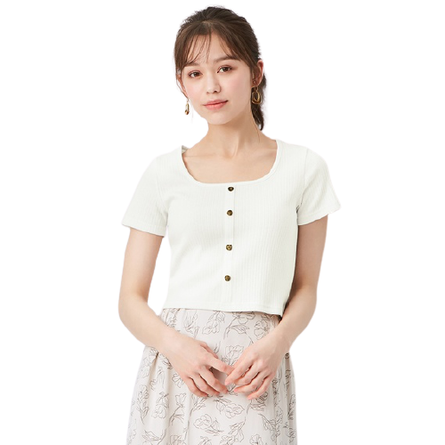 具彈性的羅紋材質能完整包覆身形,讓穿著者看起來更顯瘦,特別是短版方領設計更能凸顯女性的優雅魅力,點綴成排復古風鈕扣裝飾,能讓基本款T恤在視覺上看起來更有焦點,簡單搭配一件相近配色的碎花裙,就能為整體造型帶來亮點。