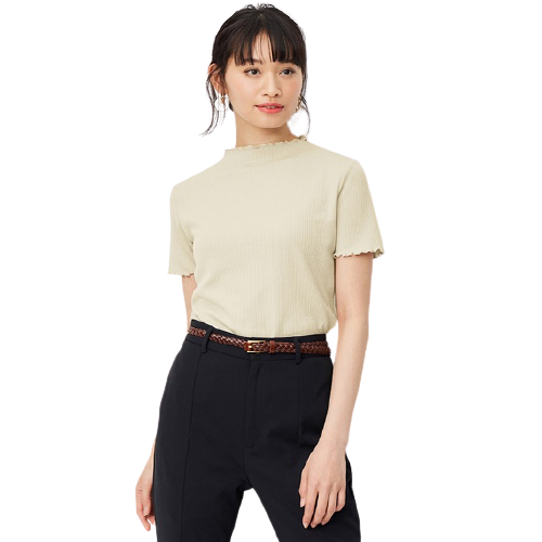 同樣也是羅紋材質,但在領口和袖口加入甜美荷葉邊飾,是一款充滿女人味的短袖T恤。流行的合身剪裁讓造型更有層次。可以單穿,也能外加外套、或當作內搭上衣與吊帶下身搭配,是日常休閒出場率極高的單品之一。