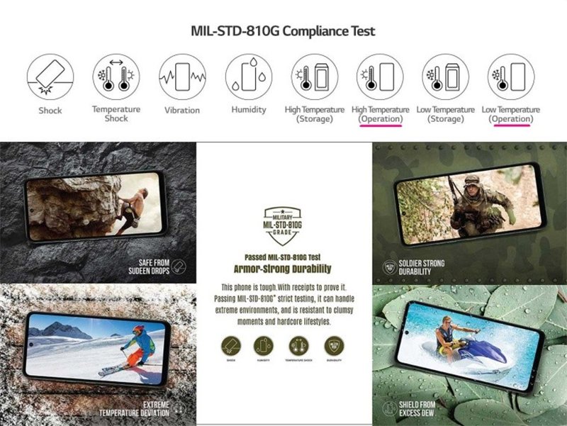 在數十種情境下,廠商可以挑選其中的部份項目來測試,並且仍然可以用上 MIL-STD 標章。在某種程度上這並不影響,舉例來說測試智慧型手機對於槍擊的阻擋並沒有意義。但是有些公司會在測試參數部分模擬兩可,對消費者產生誤導。以下面兩張圖來舉例,上圖 LG K42,在高溫與低溫部分將存放與使用中分開列出均通過標準;下圖專門生產耐用型手機的 BladeView 則僅列出了個場景卻無法得知是在存放狀態還是使用中測試。這個部分對於筆電則更加重要,因為在打開上蓋跟關閉上蓋兩種不同的狀態時,衝擊測試中會有截然不同的結果。