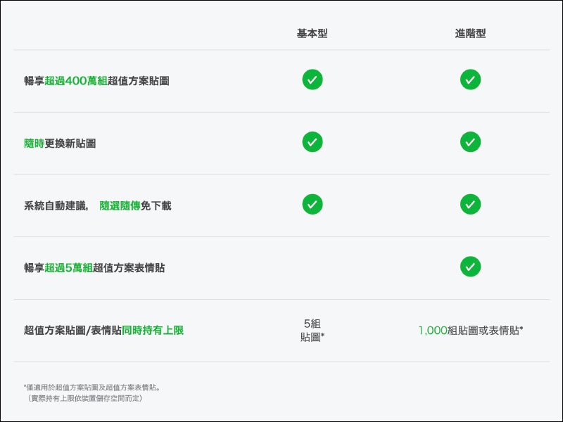 在「基本型」方案和「進階型」方案的差別還有可隨意替換的貼圖格數,基本型訂閱可同時持有 5 組貼圖、進階型方案則可同時持有多達 1,000 組貼圖或表情貼。無論選擇基本型或進階型,用戶皆可隨時更換方案內的自選貼圖。