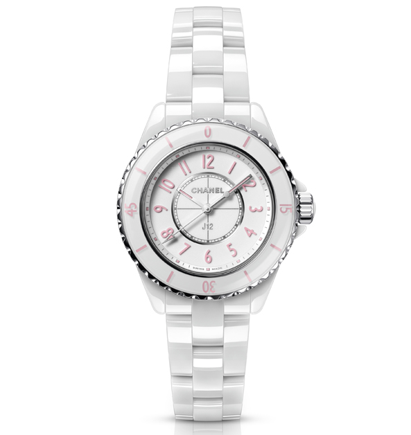 隨著香奈兒經典的「J12」誕生20周年,在今年的延續新款上,除了有致敬80年代電音文化的彩虹限量版,也有將基本的白色款變化出一點點的小巧思,將面盤上的數字、刻度及指針都用上淡淡的粉紅色,與白色的陶瓷形成鮮明的對比,畫龍點睛配色效果,完美詮釋當代女性柔美風格。
