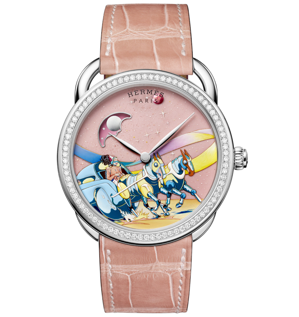 尤其喜歡愛馬仕在工藝錶款的設計,總能將那些琺瑯、蒔繪、細工鑲嵌、金雕等傳統工藝,融合成一幅幅極具當代巧思又充滿趣味性的圖案,有翱翔於空中的雪鴞、蓄勢待發狩獵的老虎、冰川上的北極熊,甚至連億萬年以前的暴龍都可以被畫出來!而在本次新推出的兩款太空賽馬圖案工藝腕錶上,也再次展現出品牌出類拔萃的手藝絕活,透過筆刷連續多次的精心繪畫,創造出細微差異、對比和獨特細節,如此精耕細作的錶面呈現,誰能不愛呢!