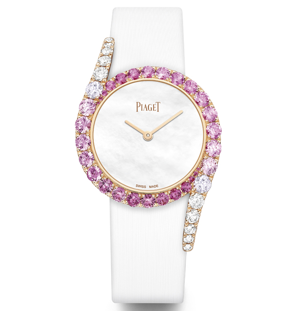 珠寶暨腕錶品牌伯爵,在2013年的時後,將一款曾在1960、70年代所推出的古董珠寶錶形狀,重新予以嶄新創意、工藝等詮釋所推出的「Limelight Gala」系列,其最鮮明的標識,莫過於錶盤上形似兩個數字9的不對稱交疊設計,簡練的線條及鑽石鑲嵌,是這系列一眼明識的華麗感。而在最新的系列延伸作中,以一款白色為底,並在錶框邊緣點綴著粉紅色漸層寶石及鑽石,戴在手腕上更顯精緻而優雅。