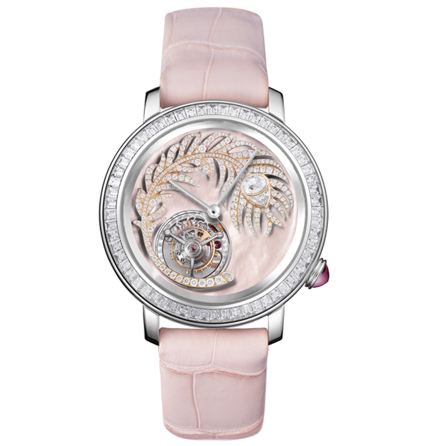 法國百年品牌Boucheron,無論在珠寶還是腕錶的靈感表現上,向來鍾情大自然主題,當然也包含了品牌常運用於產品設計中的浪漫孔雀羽毛意象。在「Epure d'Art」陀飛輪女錶系列的其中一款,以粉紅色珍珠母貝為底,讓玫瑰金勾勒而出的羽毛形狀,更襯出鑽石光芒及工藝的細膩層次,創造出猶如飄浮於錶盤上的輕盈律動之美。
