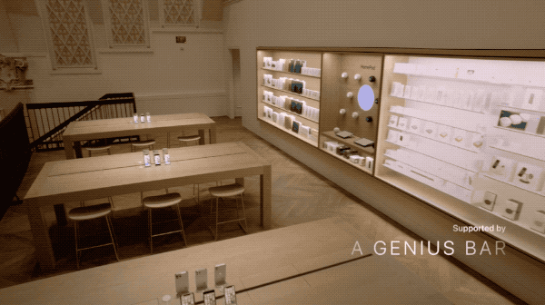 除了具有歷史意義的修復,Apple Tower Theatre 內部一樓的中心位置,被設計為展售產品的區塊;Forum 互動坊所使用的巨型螢幕,也被放在呼應原本劇院設計的舞台位置;樓上的觀賞座位區也被改造為以棕色為主的現代座椅;接近最頂端的區塊,則被規劃為開放式的 Genius Bar 天才吧的維修空間。