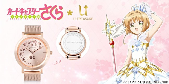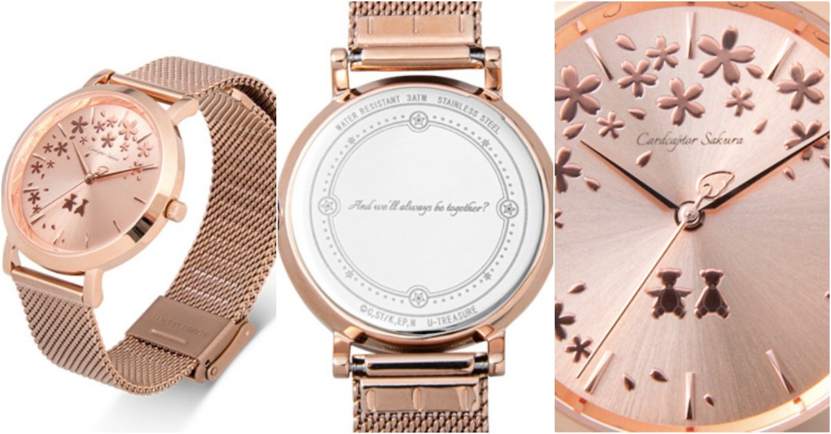 日本珠寶品牌「U-TREASURE」也與《庫洛魔法使:透明牌篇》合作,最新推一款超浪漫玫瑰金聯名錶!以小櫻、小狼重逢時的櫻花樹為靈感,朵朵櫻花灑落在錶盤上,搭配代表元素「翅膀秒針」,在下方還印著定情物2隻小熊,細節別具意義浪漫到不行~