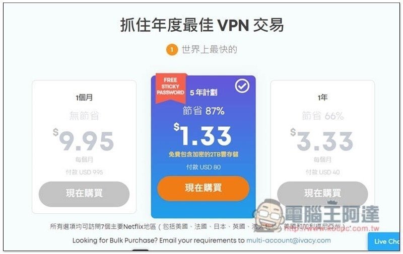 目前 Ivacy 官網的 5 年方案 80 美金已經有 87% 的折扣,換算每月約 1.33 美金,已經蠻便宜的,而且還送 2TB 雲端硬碟(第一年免費),但如果你有看到這篇文章,結帳時只要輸入「Kocpc20」折扣碼,就能再享額外 20% 折扣,變成 64 美金,省下 16 美金,約台幣 450 元。