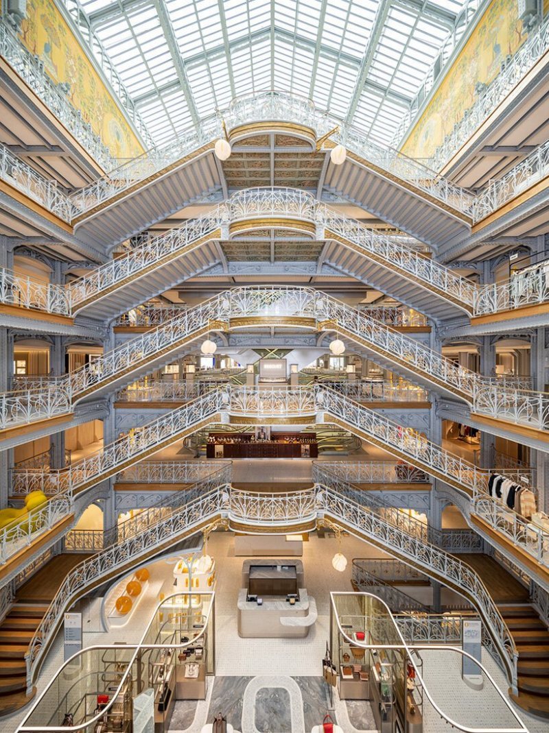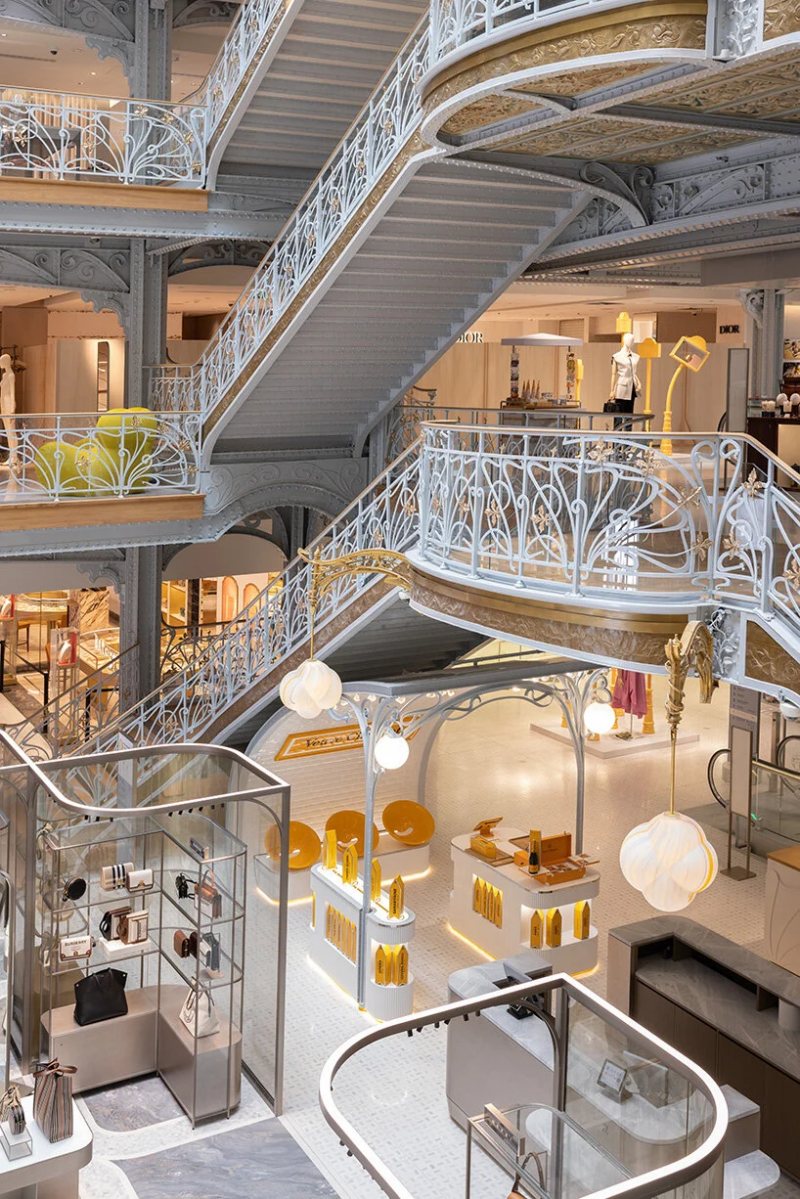 走進百貨,則有強烈的文藝復興奢華莊嚴,除了屋頂設計為玻璃穹頂,為古老建築流瀉下天際的光輝,廳內廳檢的樓梯設計也被保下來,改以原橡木製做,並處處可見金葉以及古典雕花等奢華元素。