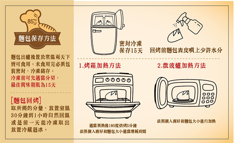 85˚C烘焙美味大公開!一般麵包出爐後置於常溫兩天下皆可食用,未食用完的則可以選擇密封包裝,冷凍儲存。待食用前回溫後,在麵包表皮噴上少許水分,依照個人喜好送入烤箱或微波爐加熱,保證不影響口感,又是鬆軟美味熱騰騰的麵包。
