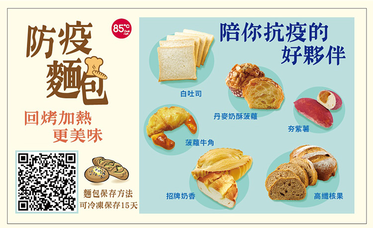 85˚C建議麵包冷凍前可以適當分切,最佳賞味期限15天,貼心消費者還特製防疫麵包小卡片,或者在門市手機QR Code掃描,都可以了解麵包的保存方法,和如何回烤加熱更美味的烘焙方式,絕對是居家存糧的好選擇。
