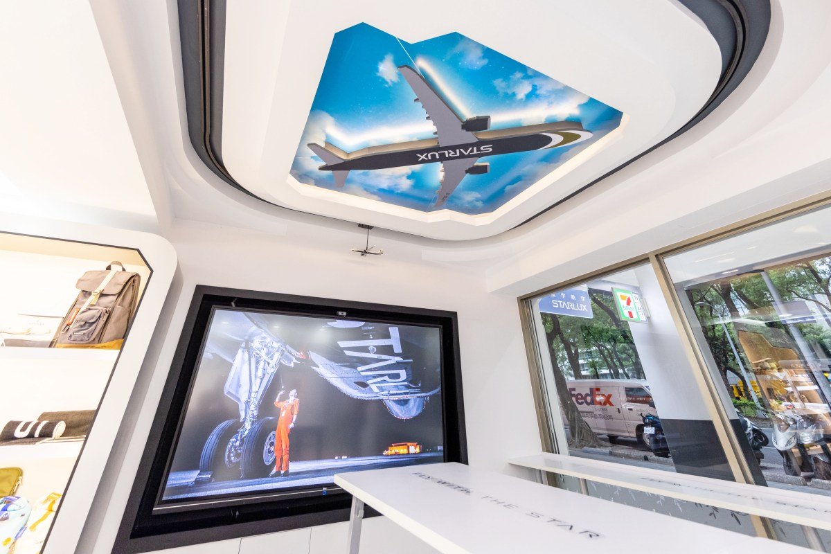 不僅外型散發星宇風格,店內還擺放世界時鐘,並定時播放登機音樂、噴灑機上香氛,天花板更特別設計立體裁型飛機燈板,飛機模型會環繞外圍軌道,中央背景會隨燈光轉換成黑夜或白晝,在櫃檯旁的螢幕還可欣賞B-58201初號機抵台花絮、A321 neo組裝(內裝)影片或星探者機上安全影片,一次滿足妞妞的視覺、聽覺與嗅覺。