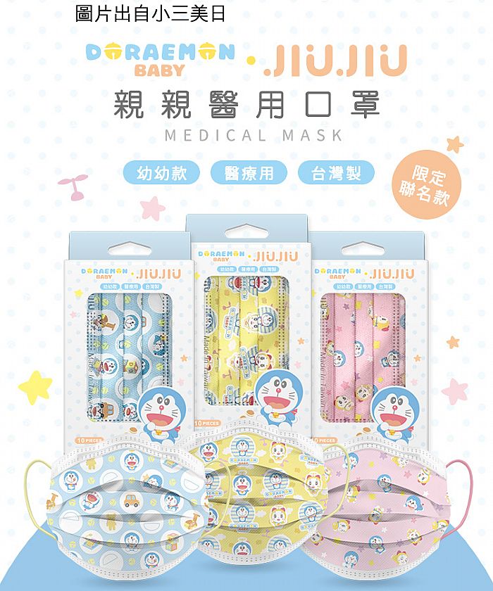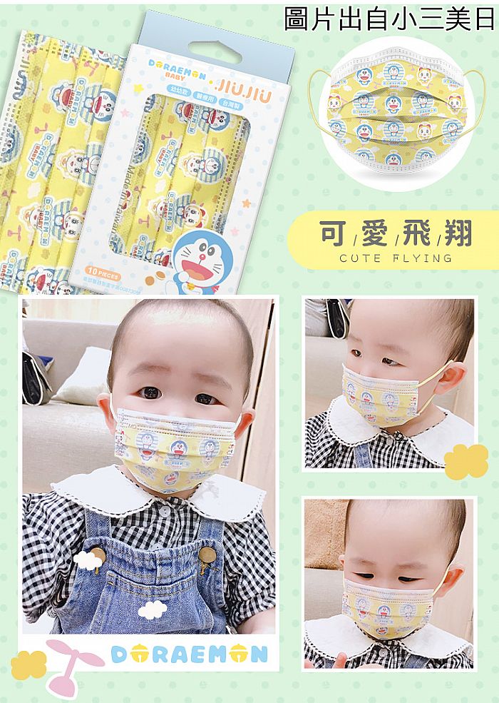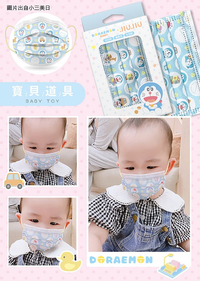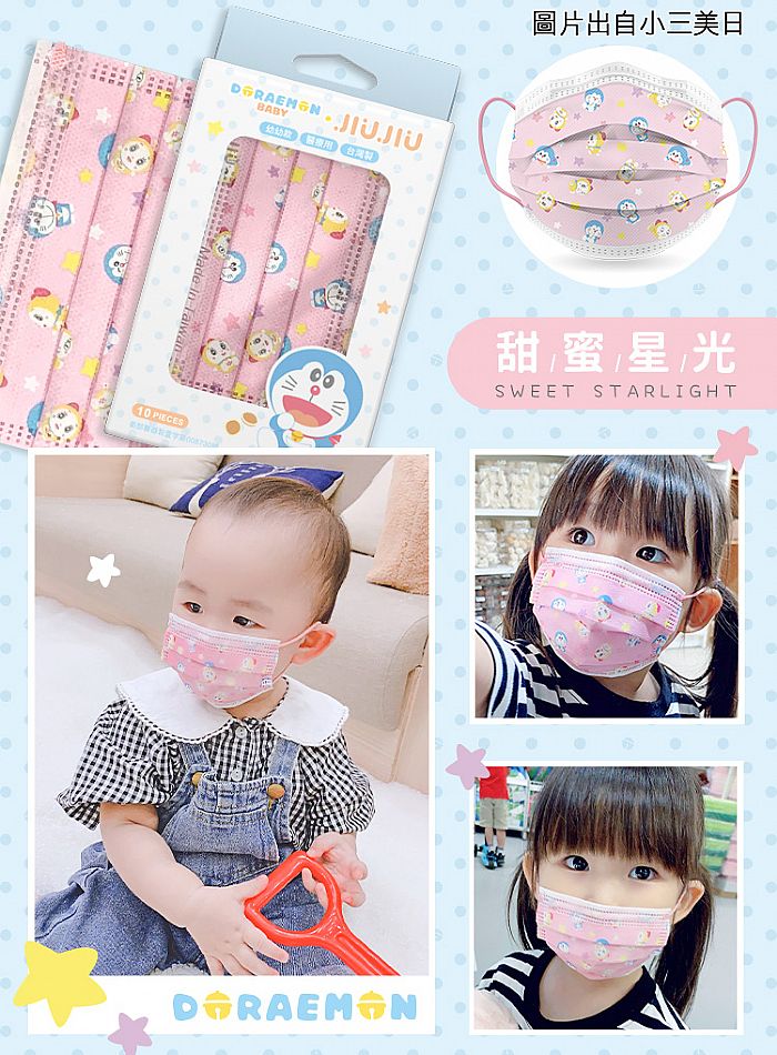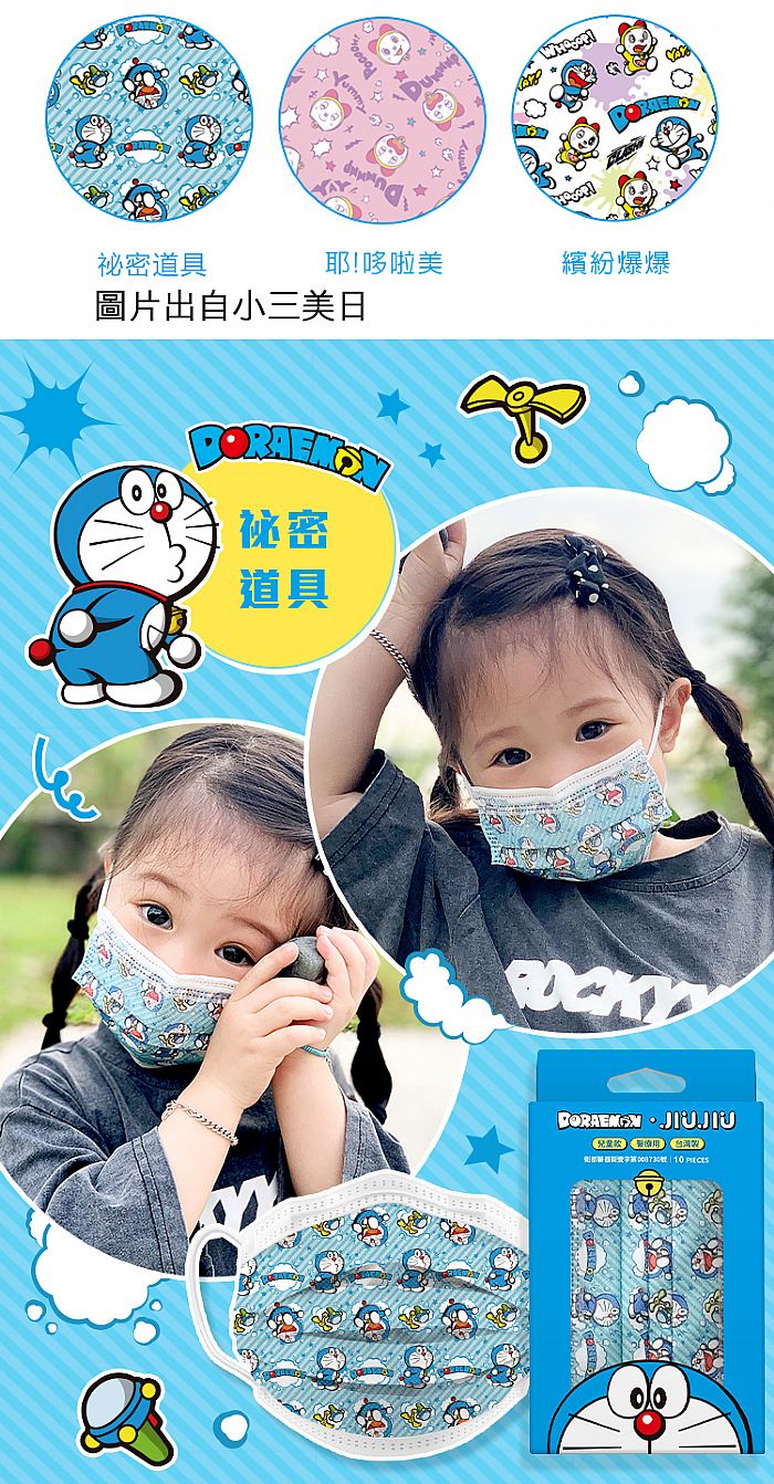 兒童款一樣有塑形鼻壓條,透氣不悶的材質讓小寶貝可以乖乖戴得住,俏皮3色可選,有藍、粉、白3種色系,來看看有哪幾款吧,兒童款的跟成人款一樣都有《#耶!哆啦美》這款喔。