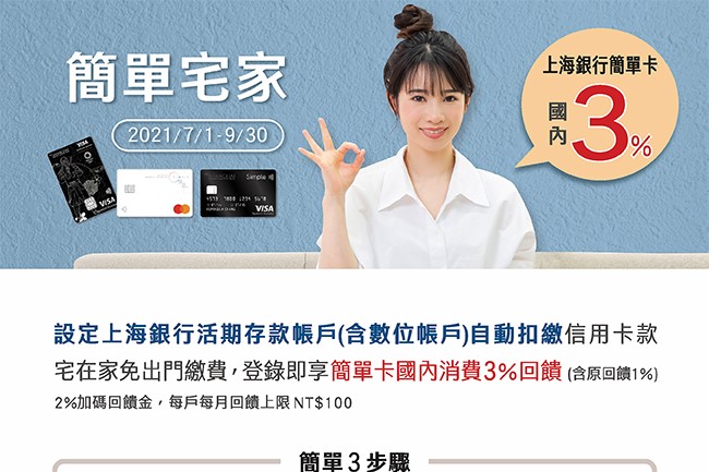 活動期間內,持上海銀行簡單卡,並設定上海銀行活存帳戶自動扣繳信用卡款,享國內消費3%回饋。 原文出處上海簡單卡 簡單宅家國內3% 相關文章分享文》短租國內Wifi分享器信用卡優惠,在家辦公、遠距學習都能用!Momo購物刷上海卡 滿額分期送4000懶人包》網路追劇聽歌正夯~Netflix、Spotify等串流平台用這些信用卡最好!【分享文】上海銀行雙卡發威!簡單卡/小小兵卡回饋殺很大