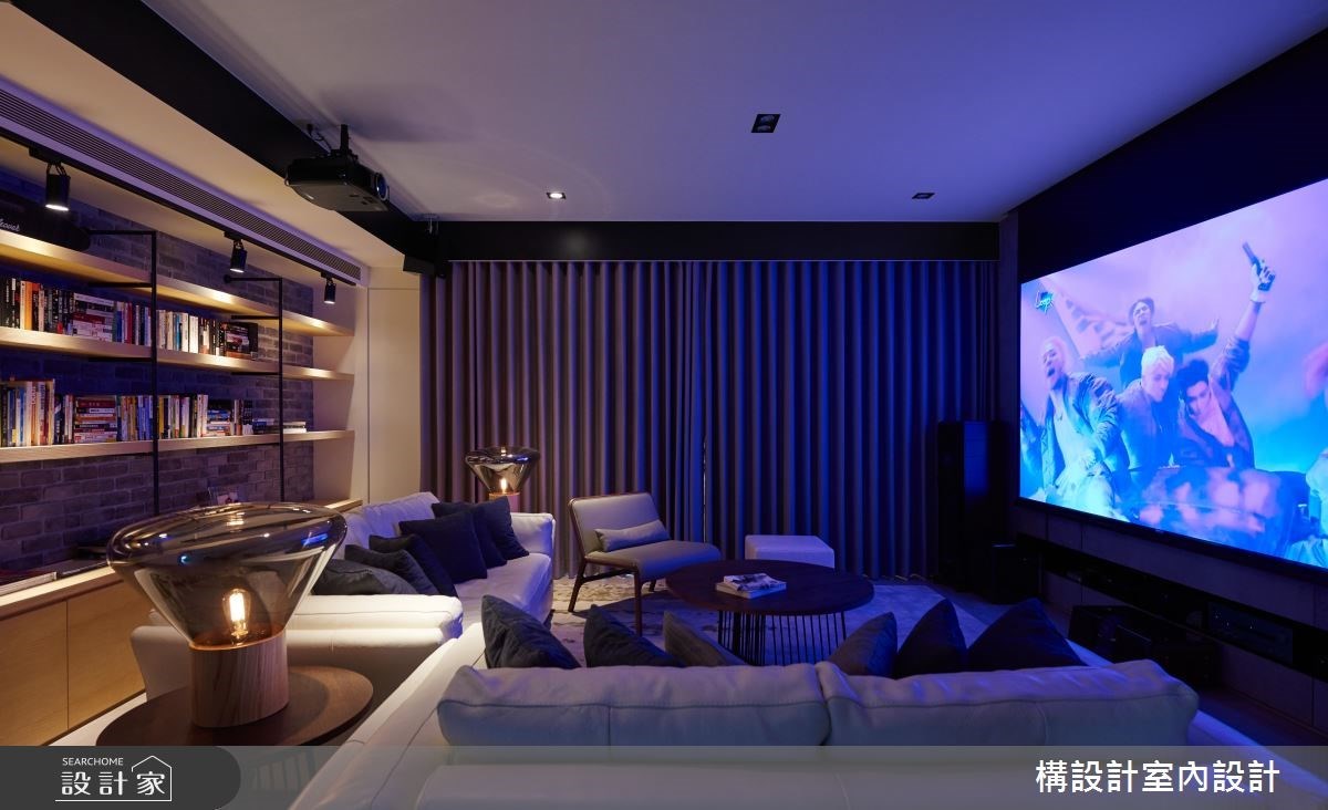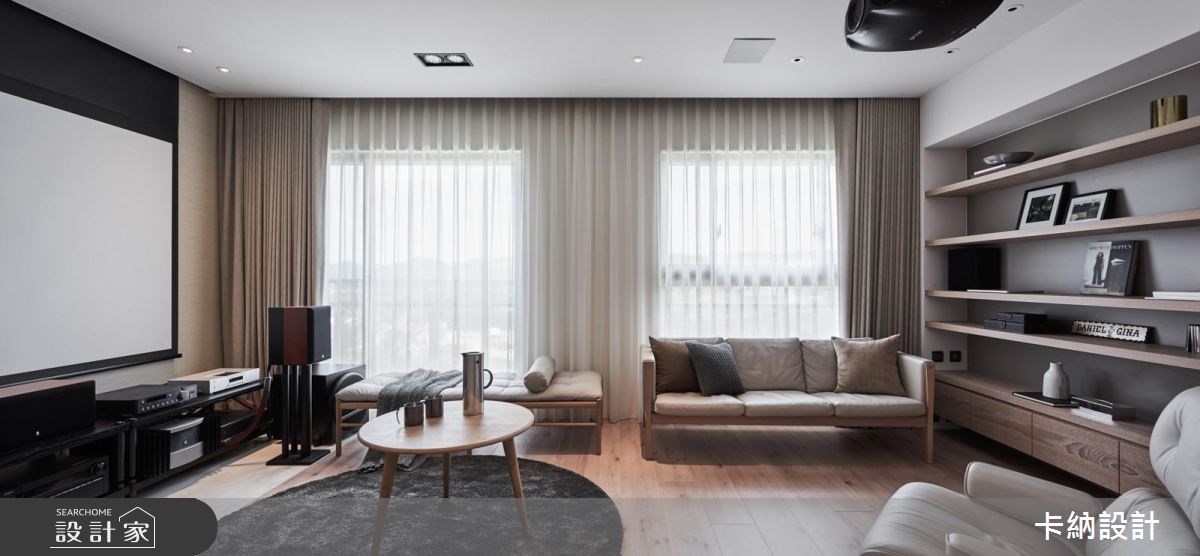 在開放式空間打造家庭劇院,最擔心空間採光會影響到視聽效果,選擇一紗一簾的設計方式,可以依照需求切換使用情境,柔軟厚實的布幔也有很好的隔音效果。