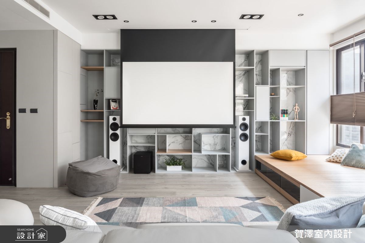 如果是小坪數的居家,或只打算做獨立視聽間,因為軸距較短,建議以大尺寸的電視螢幕取代投影幕設計,觀賞電影或打電玩時,視野比例會比較合適,也能避免抬頭看螢幕的疲勞不適感。