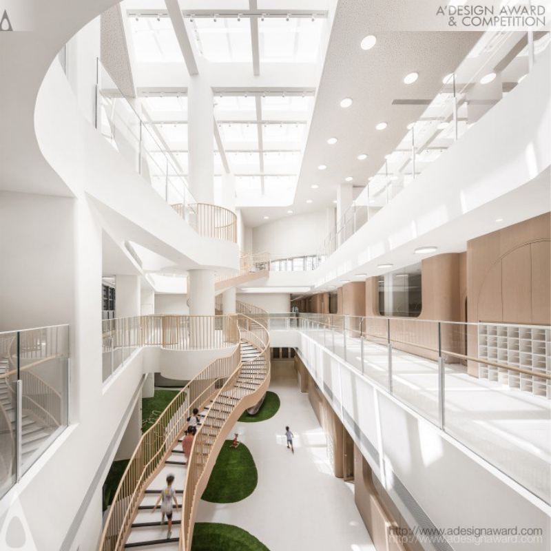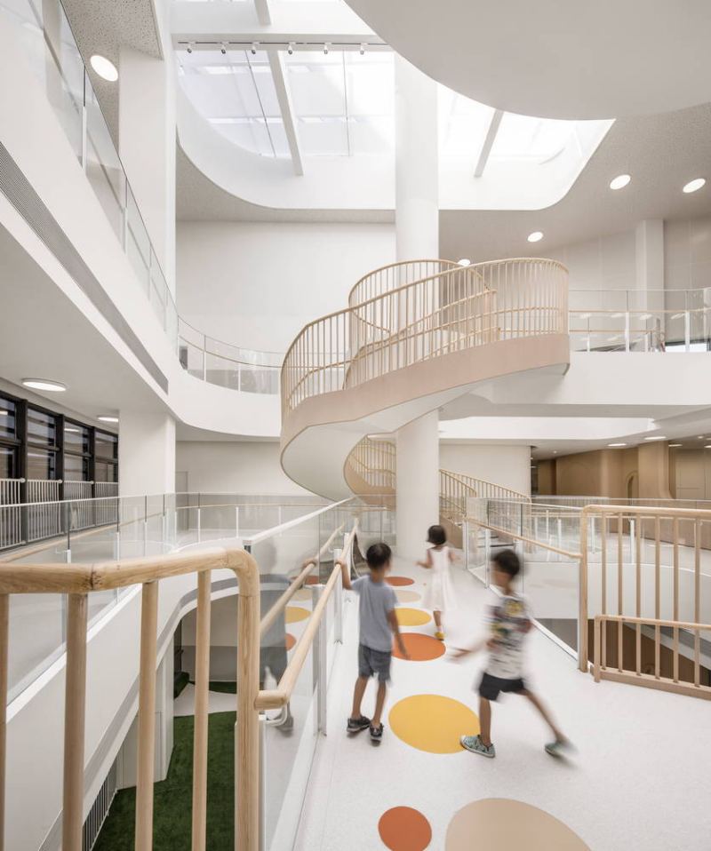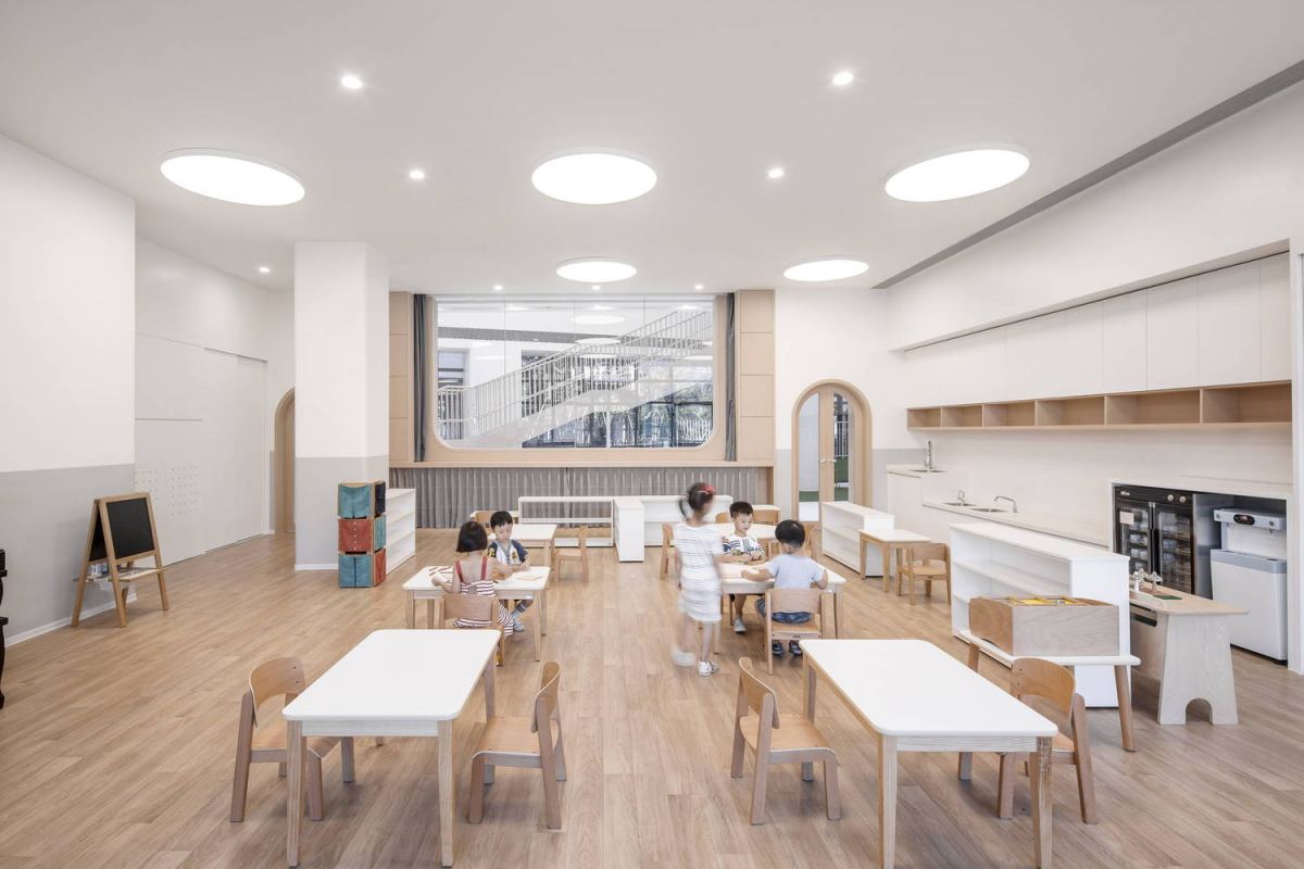幼兒園基本採用淺木色,以及廣泛運用透明膠合玻璃營造純淨、公平、安靜的環境。圓弧角而不是尖角的設計有助於減少潛在危險,孩子們可以自由、安全的玩耍。