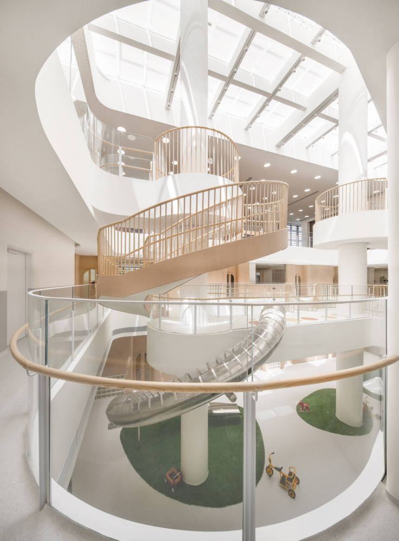 三樓提供了連接室內和室外的活動區,其中軌道是中庭的盤旋而上的延伸,分隔出各種主題活動區域。其中幼兒園也貼心地考慮了2-6歲孩子的需求,將設施區分為 1.5-3 歲兒童和 3-6 歲兒童的設施。