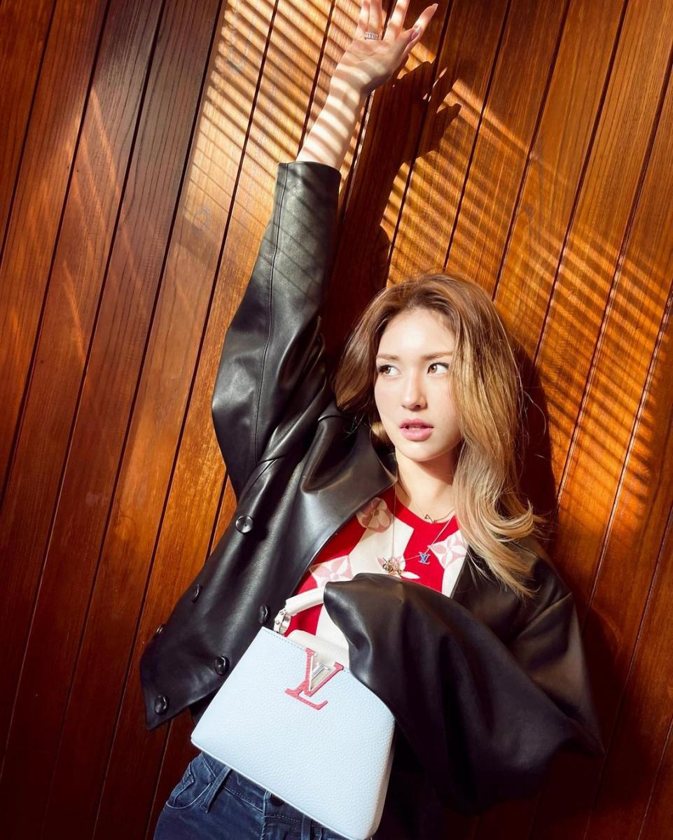 由路易威登女裝創意總監Nicolas Ghesquière在2013年推出的Capucines提袋,一直是眾多女明星的心頭好,而照片中Somi手上的撞色組合則是2021年春夏推出的全新限定配色,採用純白、天藍、正紅的全粒面Taurillon皮革製作,搭配上經典LV Initials標誌,無論搭配甜美洋裝或率性丹寧皮衣都零違和。