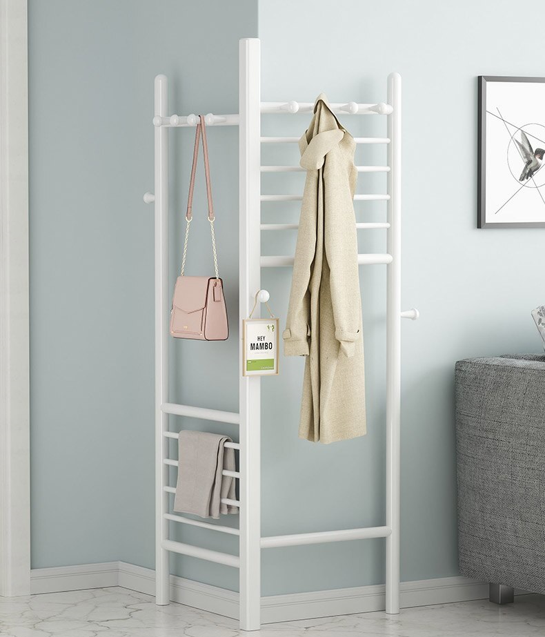 - 落地衣帽架:一般具有面積較大的底座,也一定程度的增加了能夠乘載的重量,所以可以放置物品的量也較多,可以算是一個簡易的衣櫃,如果可以選擇底座有搭配輪子這種可移動的樣式就更棒了!
